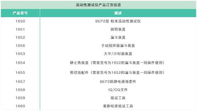粉末的流动性取决于几个因素,有些与粉末原材料有关,有些与实际生产过程有关,例如粉末从容器(料斗、漏斗、圆筒等)流出的能力或制成片剂时的可压缩性。美国药典<1174>章节和欧洲药典2.9.36章节药典推荐了三种测试粉末流动的方法: