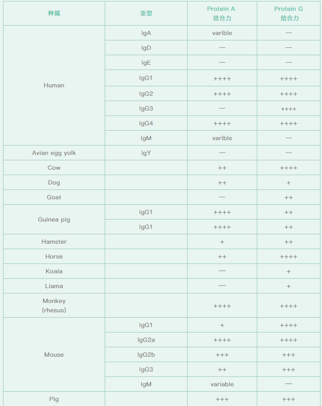 下表是 Protein A和Protein G对不同抗体的结合能力: