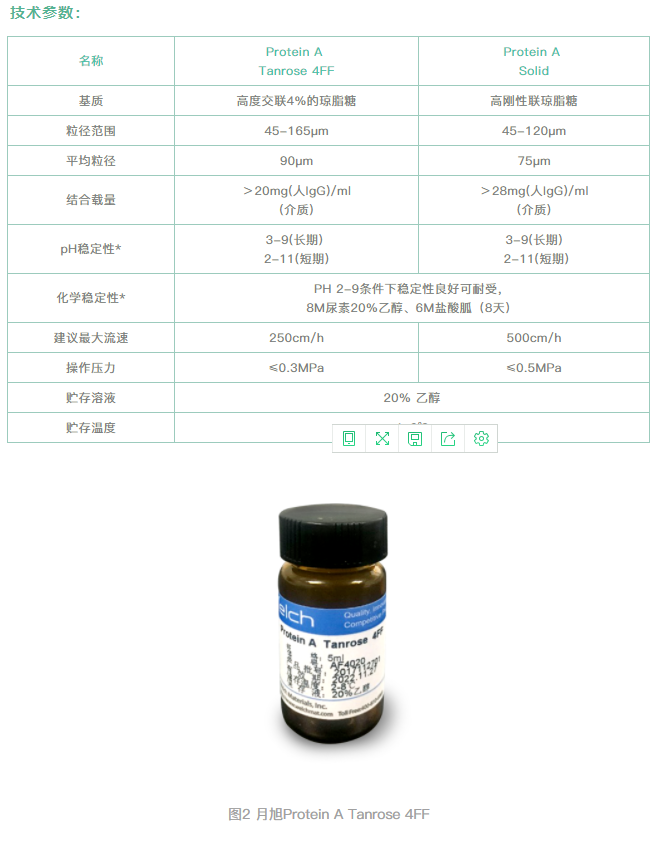 重组蛋白A配基是通过硫醚键单点偶联在琼脂糖凝胶基架上而制成抗体亲和介质,由于重组蛋白A去除了其白蛋白结合区,所以能够特异性结合IgG及Fc融合蛋白,并且在配基和介质生产过程中没有带入动物来源组分。