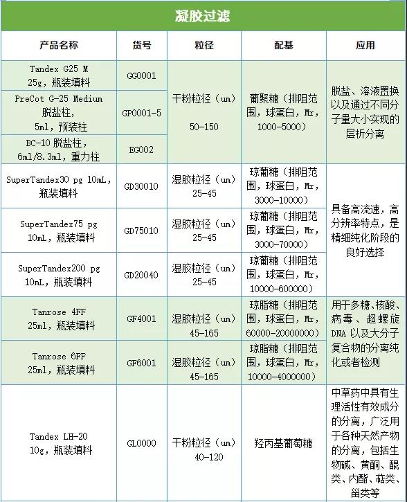 琼脂糖系列(Tanrose)、葡聚糖系列(Tandex)、琼葡糖系列(SuperTandex)、高刚性琼脂糖系列(Solid)等。