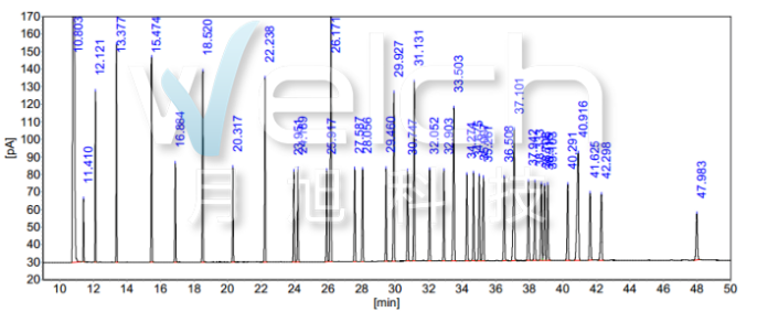01、色谱柱相关介绍 名称规格:WM-CN100, 100m*0.25mm*0.2μm。 更高使用温度:240/250℃; 货号:07965-25011。 02、适用范围 适用于食品中37种脂肪酸含量的测定。 参考标准:《GB 5009.168-2016食品安全guo家标准 食品中脂肪酸的测定》。 03、优化后色谱条件 色谱柱:線上賭場Welchrom® WM-CN100(100m*0.25mm,0.2μm)。 柱温箱:0-6min:140℃,然后以4℃/min升温至240℃,并在240℃维持20min; 进样器:260℃; 检测器:260℃; 柱前压:36.5psi; 分流比:30:1; 进样量:1μL。 04、色谱图