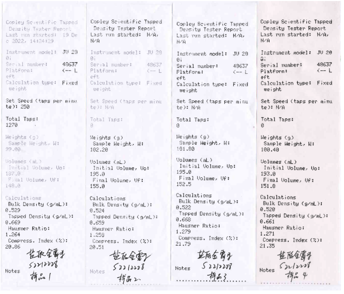 振实密度测试实拍图 数据处理 更后,我们来看下数据处理界面,其中左侧涉及样品称量,V0(表观体积),Vf(V1250振实体积),右侧涉及振动次数、堆密度、振实密度、豪斯比率、压缩指数。所有需要的参数都可以一目了然呈现并且打印出来。 本次试验一共测试了4个盐酸金霉素样品,堆密度平均值为0.524g/mL,RSD为0.8%;振实密度平均值为0.664g/mL,RSD为0.8%,从数据上看,重现性和平行性都是十分优xiu的,怎么样?如此优xiu的JV 200i是否配得上优xiu的你呢? 更后附上本次检验记录供大家参考