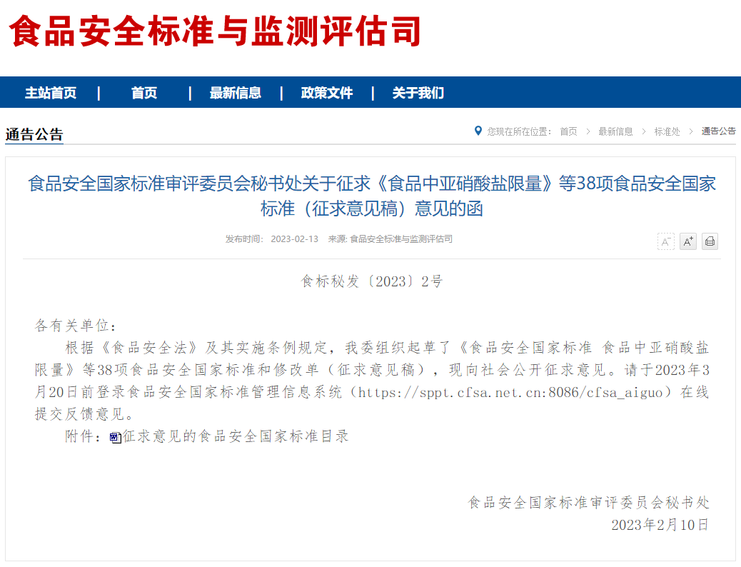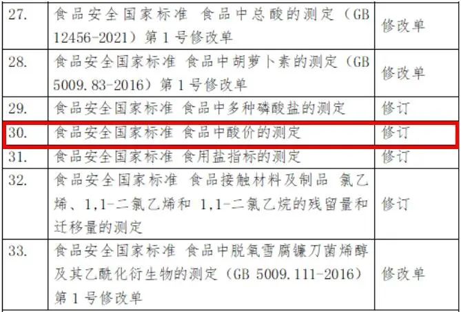 2023年2月13日,guo家卫生健康委员会食品安全标准与监测评估司官网发布相关公告(食标秘发〔2023〕2号),对《食品中亚硝酸盐限量》等38项更新制修订的食品安全guo家标准的征求意见稿,向全社会公示并征求意见。更新修订的《食品安全guo家标准 食品中酸价的测定》(GB 5009.229)也包括在内。