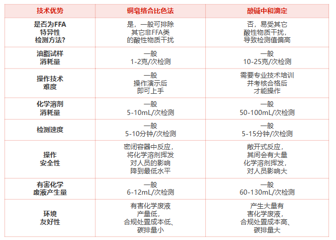 相较于酸价传统的酸碱中和滴定检测方法,铜皂络合比色法主要的技术优势见下表: